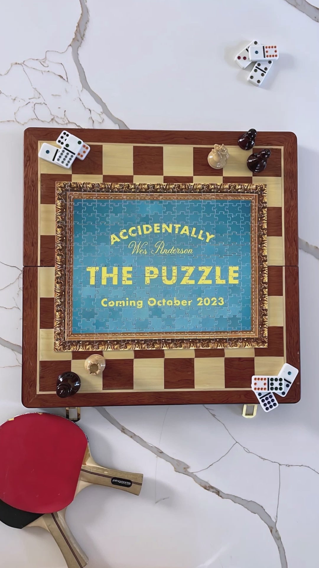 The background: Amanda and Wally (aka Accidentally Wes Anderson @accidentallywesanderson) were asked to select a single photo as the centrepiece for this perfect puzzle. Instead, they suggested including the entire AWA catalog of thousands of photos, but their publisher said the puzzle would be way too big (*the crowd boos*).